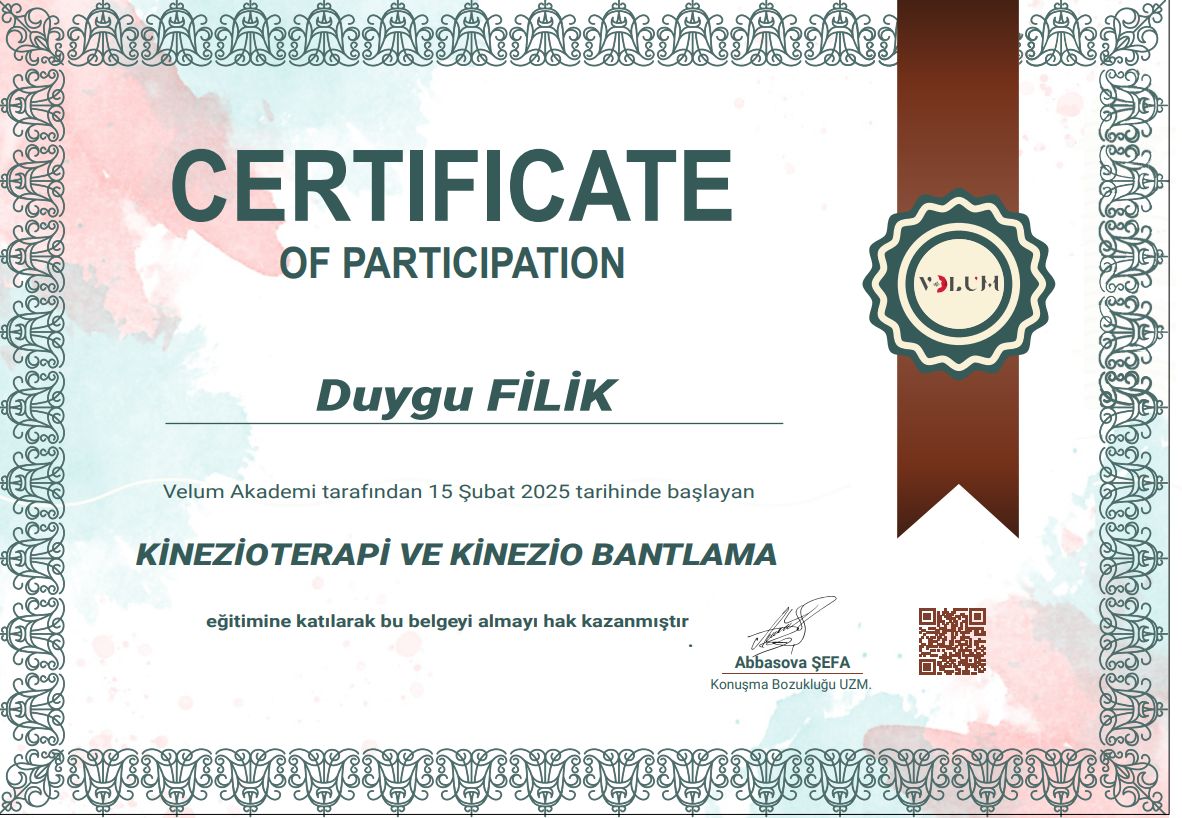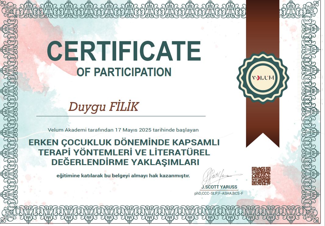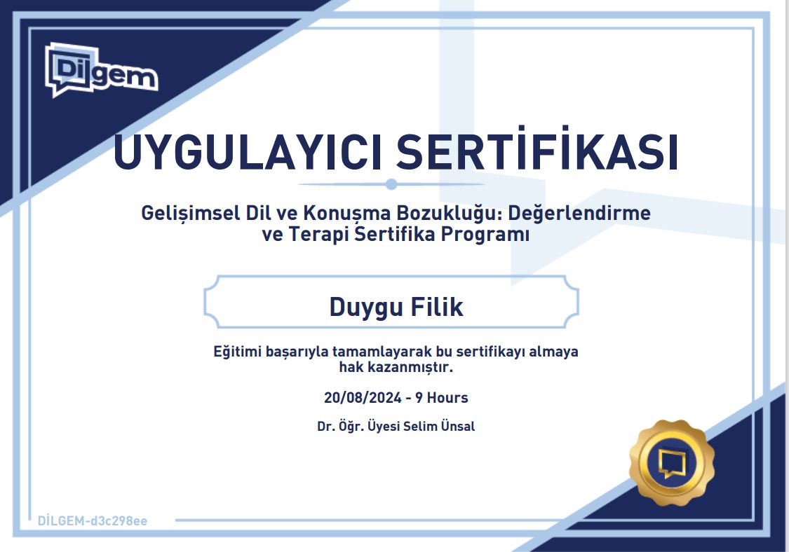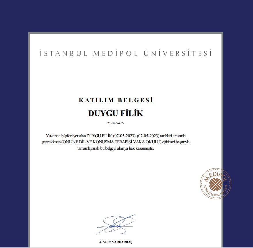 Dil ve Konuşma Terapisti Duygu Filik, lisans eğitimini Medipol Üniversitesi Sağlık Bilimleri Fakültesi Dil ve Konuşma Terapisi bölümünde Yüksek Onur derecesiyle tamamlamıştır. Eğitim süreci boyunca çeşitli hastanelerde, rehabilitasyon merkezlerinde ve özel kliniklerde kapsamlı staj deneyimleri edinmiş; farklı vaka profilleriyle çalışma fırsatı bularak klinik becerilerini güçlendirmiştir.